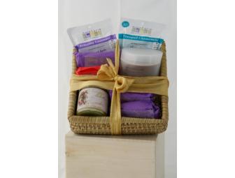 A lovely basket filled with home made soaps, arnica salves, healing balms and other bath products.
