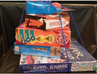 Geppettos Gift Package of Games; Deluxe Super Scrabble, Penguins on Ice, Jungle Speed, Nowhere to Go, Classic Japanese Skill Toy