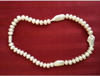 This elegant and modern cultured freshwater pearl single strand necklace features milky white, luminescent freshwater pearls and creamy, lustrous cultured freshwater baroque pearls strung on double-knotted white silk thread and affixed with a sterling silver magnetic clasp. This modern twist to a traditional pearl necklace is a fabulous addition to any jewelry box. There are 46 freshwater pearls, which range in size from 10.5 to 11.5 millimeters in diameter and 3 texturous and sheen baroque pearls. The necklace measures approximately 19 inches in length.