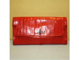 Paint the town red with your lipstick and valuables stashed inside of a Red Snakeskin Clutch with Silver Buckle.