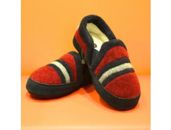 On a cold night your child will love these Burgundy & Blue Stripe Wool Slippers by Acorn