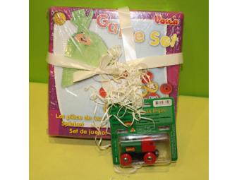 Game magnetic set by Volia - game can used to play checkers, chess and other board games. A classic train engine by Brio is attached. Ages 3 and up.