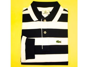 For your favorite rambunctious yet fashion-conscious 8 year old. Lacoste Long-Sleeved Polo Shirt in Black & White Stripe. Size 8Y.