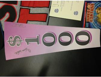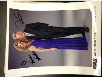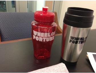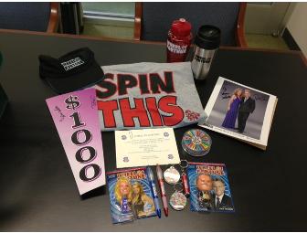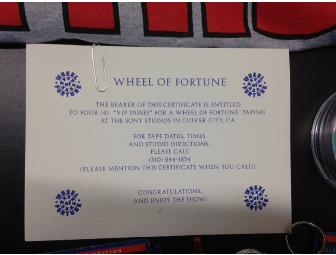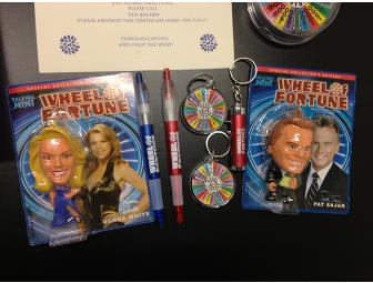 Wheel of Fortune VIP pack including 4 VIP tickets to a show taping, a photo and wheel wedge autographed by Pat Sajak and Vanna White, keychains, a hat, a water bottle, a coffee mug, and two bobbleheads!