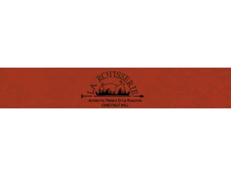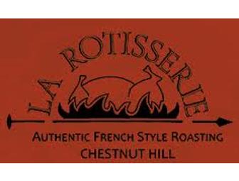 Winning bidder will receive a $30 gift certificate from La Rotisserie, authentic french style roasting to take home or have delivered, located in Chestnut Hill.