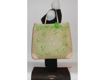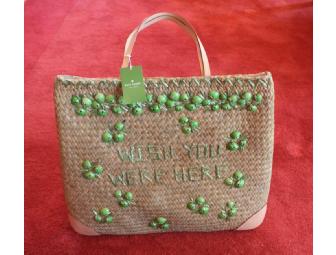 Kate Spade - NY Gemina straw leather tote beach bag with green seashells features "Wish you were here" on the front.