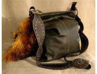 Black leather and orange/brown /black sherling, studded shoulder strap.