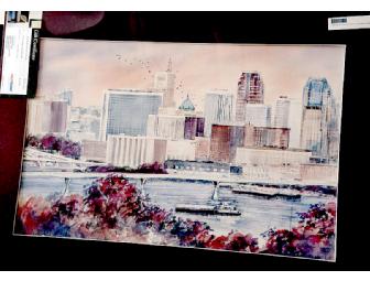 This watercolor, “Minneapolis,” depicts the iconic Stone Arch Bridge framing the 1970’s Minneapolis skyline, in blues, purples and maroon tones. Number 504 of a limited production run of 900, the 28” by 32” print is signed and professionally matted.
