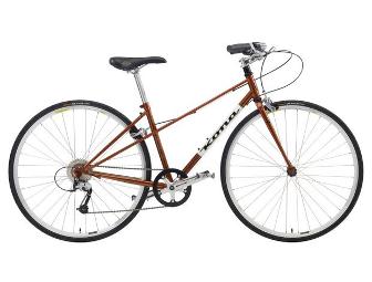 2012 Kona Roundabout: The Kona Roundabout is a mixte-style bike made of chromoly steel. The brand’s signature sloping top tube and compact rear triangle (short chain stays and seat stays) are designed to ease pedaling and enhance acceleration and corner handling. This versatile model features a single chainring up front, nine-speed gearing in the back and 700c tires; it can also be installed with fenders and a rear rack.