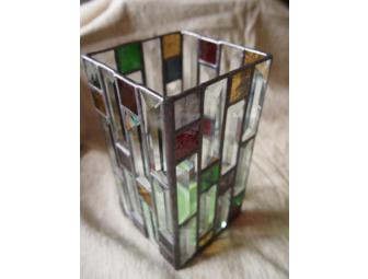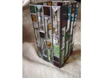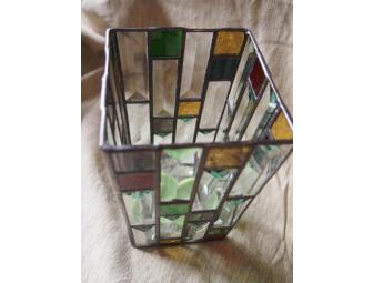 Winning bidder will receive the beautiful stained glass hurricane lantern complete with votive candle cup and removeable mirrored base. Included is a clear glass cylinder vase that converts to a vase cover for flowers.