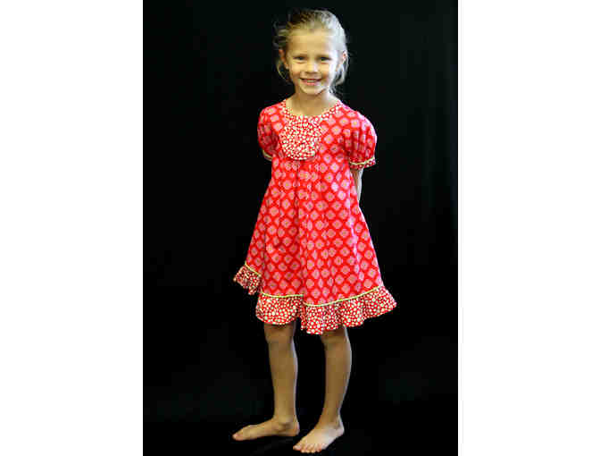 An adorable Size 4 Girls Dress by Lucky Cloud Clothing. This dress is Red and Pink with apple green trim. The bottom of the dress has a ruffle trim.