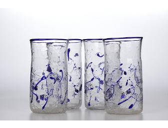 Take home four hand blown glass tumblers created by Charlie Miner, founder of the Tesuque Glass Works in Tesuque, New Mexico. Charlie Miner's works are in many permanent collections, including the Corning Museum of Glass and the Smithsonian American Art Museum. Charlie Miner opened Tesuque Glassworks in 1975. The studio gallery has grown over the years, representing glass artists, with glass artists actively blowing glass daily in the studio. The Glassworks functions as a gallery, school, production studio, and a place to see and learn about glass.