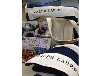 Head to the beach in style with a gorgeous Ralph Lauren tote bag filled with beach essentials: two large RL beach towels and Ricky Lauren's The Hamptons for summer reading or summer coffee table decor.