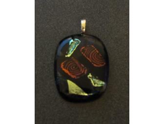 Pat has been a glass artist for over thirty years and is our very own Christine Matulewicz's mother! This lovingly created handcrafted stunning black dichroic glass pendant has orange and silver accents, with hints of red, green and blue. It measures about 1 3/8" in width and 2 1/4" in length.