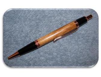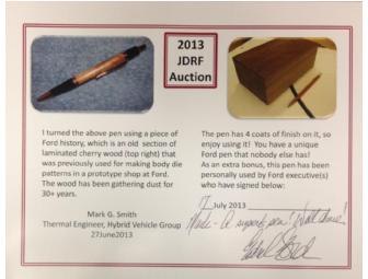 This pen was created from an old (30+yrs) piece of laminated cherry, from a body die pattern prototype shop here at Ford Motor Company. It has recently been personally used by Edsel B. Ford II and comes with a signed/dated certificate by Mr. Ford. The pen has 4 coats of finish on it, so enjoy using it! This is a "unique" piece of Ford History Past & Present.