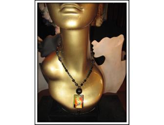 Faceted Onyx Necklace with Picasso Art Pendant, hand painted.