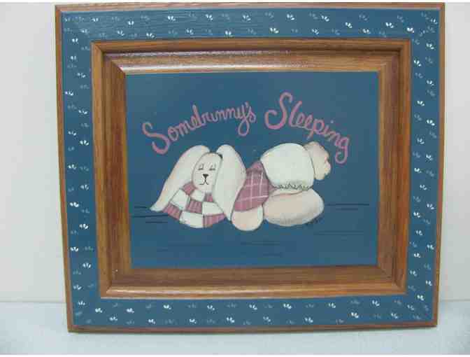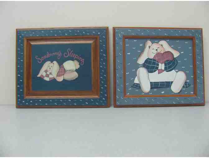 This pair of Handpainted Bunny Pictures have been handpainted on wood and would be perfect for a baby's room as one says "Somebunny's Sleeping".