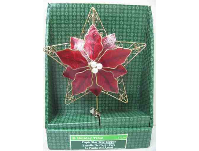 This Holiday Time Capiz Star Tree Topper features a red shell poinsettia with white bead berries on a gold wire 3D star.