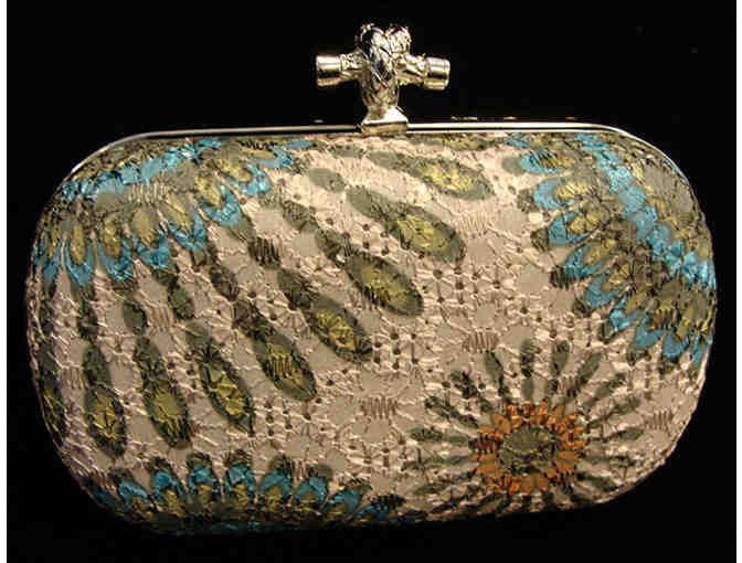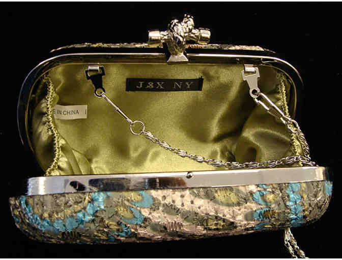 Shop one-of-a-kind contemporary and vintage styles in apparel, accessories and jewelry with this $25 gift certificate to Timeless Styles in Skippack, PA. Also included is a beautiful hard case clutch purse featuring the beautiful peacock hues of green, blue and orange. The purse is adorned with silver edging and a silver rope knot clasp. Also includes a silver chain strap and green satin lining.