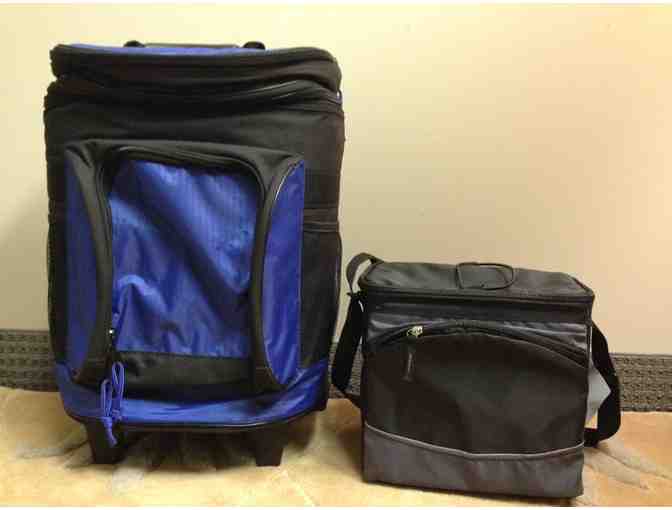 Take home the ultimate cooler package. Includes a 30 can cooler on wheels, and a hard sided lunch cooler.