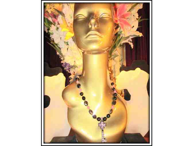 Black Onyx Necklace with Pink Aurora Crystal Accents and KEY Drop Pendant