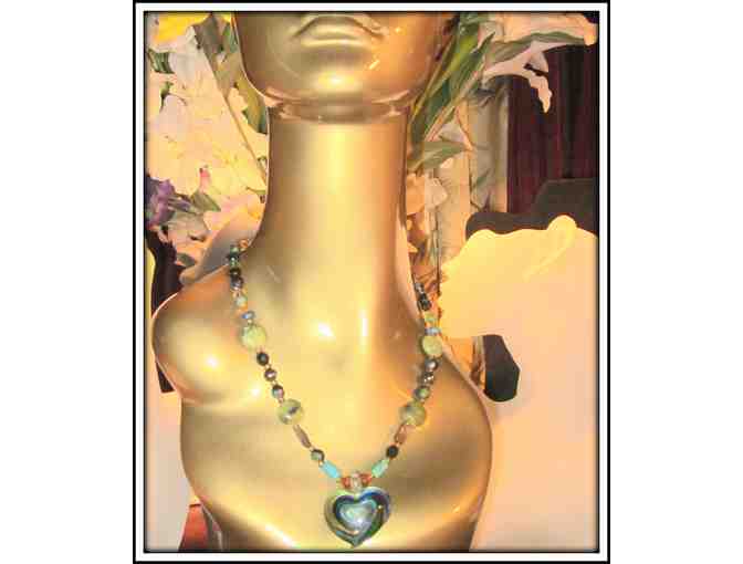 Featured Components: Chinese Jade, Black Onyx, Turquoise, Hematite w/Art Glass Heart Pendant