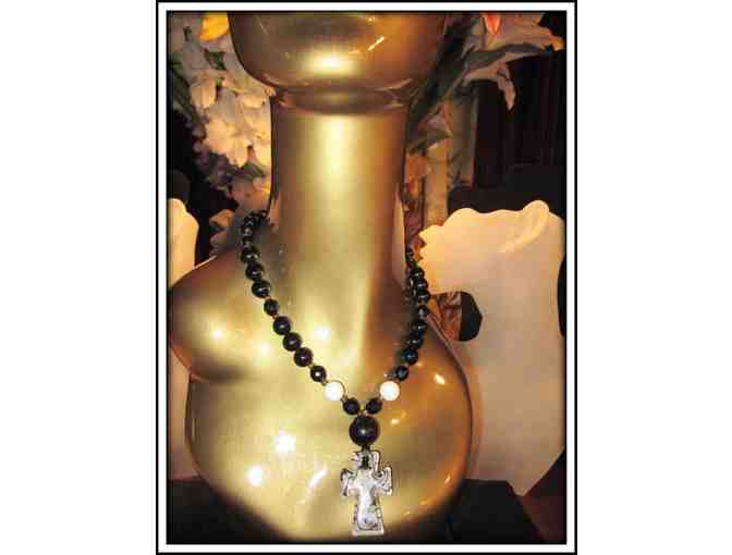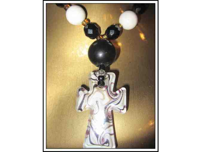 ONE OF A KIND GEMSTONE NECKLACE WITH BLACK AND WHITE ART GLASS CROSS PENDANT
