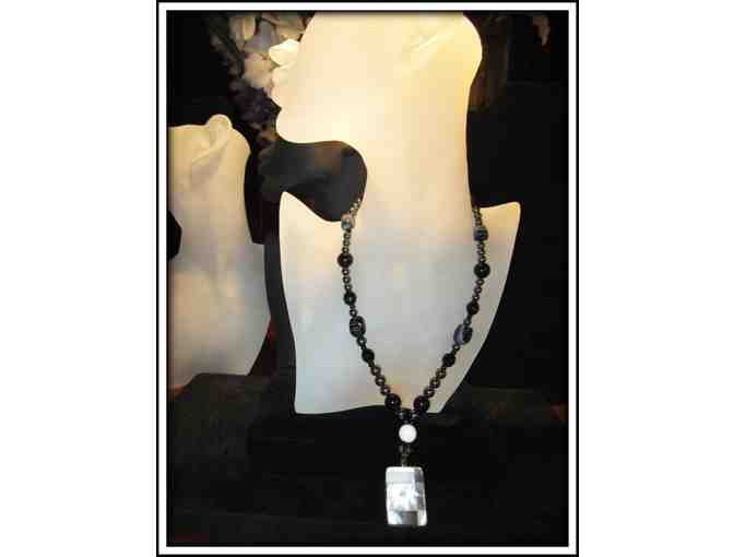 BLACK ONYX NECKLACE WITH MOTHER OF PEARL INLAID ABSTRACT ART PENDANT