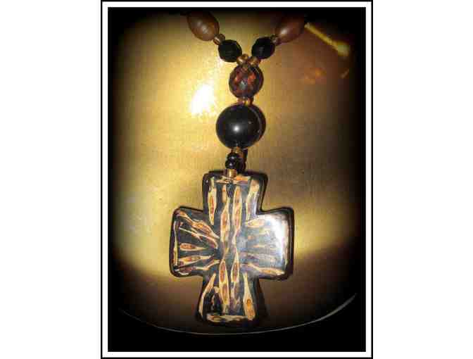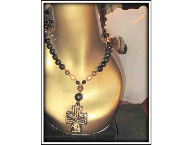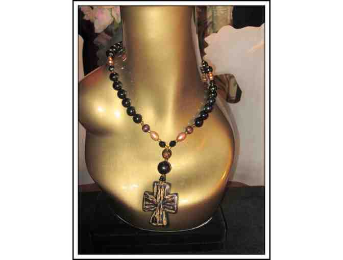 Featured Components: Large Black Onyx, Faceted Onyx, Bronze Pearls, Smokey Topaz, Cross Art Glass Pendant