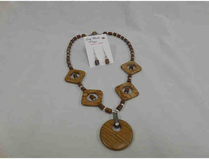 The necklace and earrings set is designed and created by Carolyn Cave of Lady Beadle Designs.