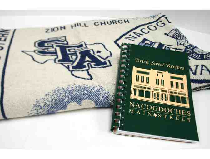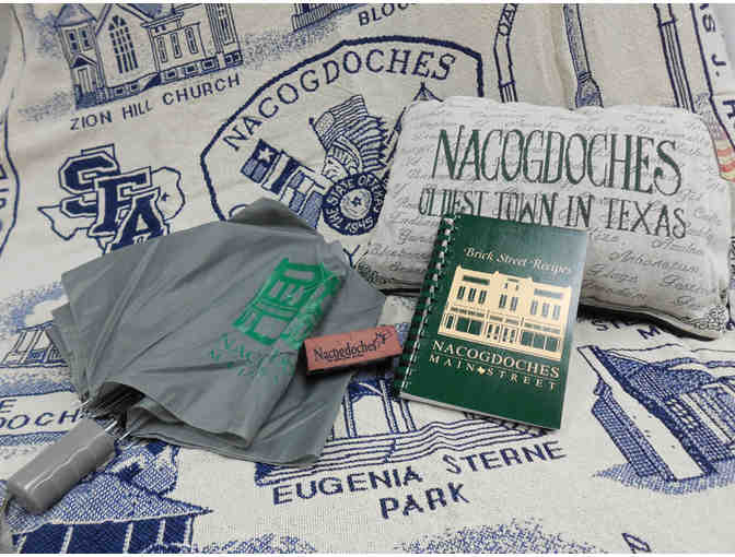Show your love of Nacogdoches when you cozy up with the Nacogdoches afghan and throw pillow, cook a meal from the popular Brick Street Recipes, or head out in the rain under the pine curtain with a Nacogdoches Main Street umbrella. Plus you get a mini replica of the brick streets downtown!