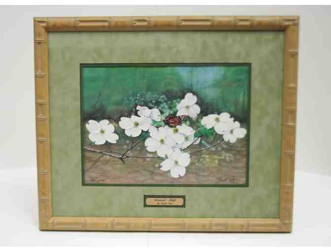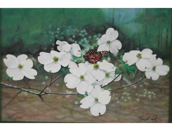 Bid on this beautiful painting by local artist and custom framer, Harold Coats. This painting is 451/950 and features a Monarch butterfly resting on a dogwood bloom in the middle of a forest.