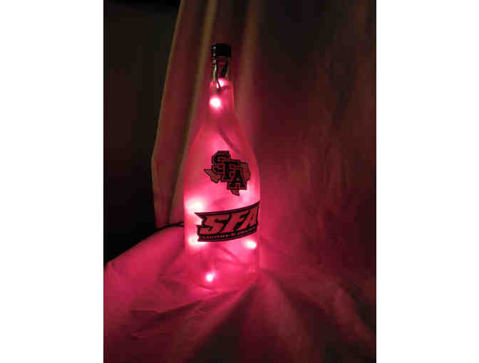 Let your SFA pride glow with this wine bottle accent light. Frosted glass with Angry Axe logo and purple lights.