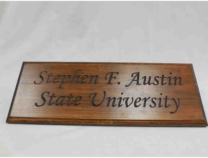 Be the owner of this wooden SFA plaque! Measuring 20" W x 7" L, this stained plaque has Stephen F. Austin State University burned into the wood.