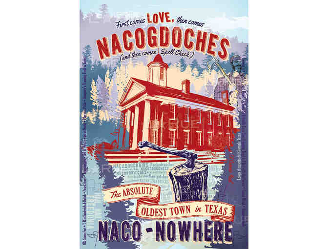 This features a folksy, pop art, country art style design of the oldest town in Texas. The poster includes the tagline of: First Comes Love, Then Comes Nacogdoches (& Then Comes Spell Check). It is largely red and purple with many shades of violet and blue and light tan. It's given a rustic and vintage look as well, but the main features here are the insights about the town. SFA State University, Lumberjack, the affectionate nickname of Naco-Nowhere and common and not-so-common misspellings of the town name. Even references to the Old Stone Fort, Sam Houston, US soccer player Clint Dempsey & the Marx Bros. are included. *See more commentary and details at www.LaRueArtandCopy.com