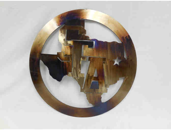 Display your SFA pride with this metal circular sign featuring the SFA Texas logo with a star at Nacogdoches. The sign has a purple sheen that adds a little Lumberjack character. 15 1/2 inches in diameter.