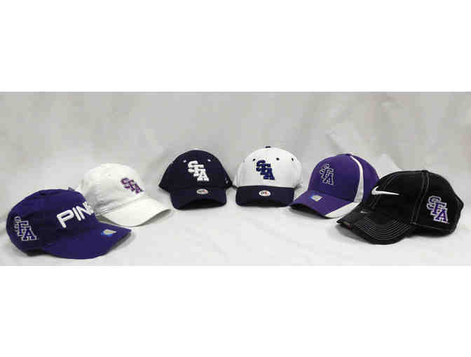 6 hats including two SFA Ping golf hats, one Nike golf hat, two Zephyer stretch hats, and classic white SFA hat.