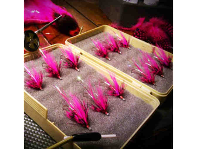 "I created a fly to help promote "Casting for Recovery" through The Gorge Fly Shop. CFR is a breast cancer support group which uses fly fishing RETREATS to help heal sufferers both mentally and physically. "Angel Girl" Steelhead flies (named after my wife Angelique, who is a breast cancer survivor) and specifically designed to represent CFR. 12 flies all bundled in a Gorge Fly Shop fly box. Angelique Garrett and her Mama, Rosalie Stavaas were featured in a cancer survivor add for Celio Treatment center, my wife was gearing up to join me in my guide service business before cancer struck. We had bought a second drift boat and she was excited about joining me. Then chemo, radiation and several surgeries wouldn't allow her to do the job...she's an amazing woman who loves life and her family - she is a survivor!" John Garrett
