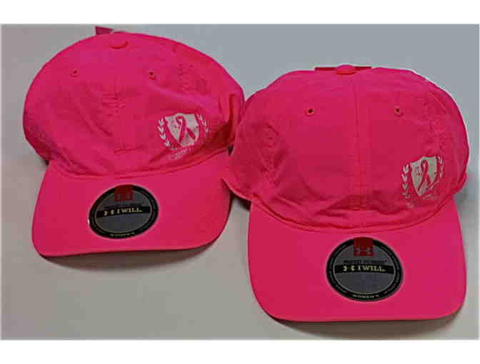 Two Under Armour baseball caps--one for you and one for a friend--and perfect for outdoor activities (indoor too, for that matter)! Not only will you be showing your support in wearing one, but you will also be showing yourself! They are neon pink and highly visible and have a white support ribbon and Under Armour logo. 100% polyester.