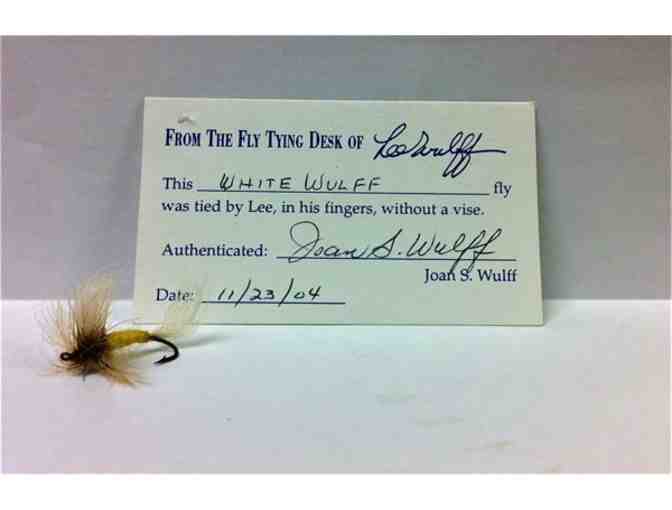 Tied by Lee Wulff without a vise and authenticated by Joan Wulff. Where else might you find this special item? We are lucky to have two to offer our bidders. A Yellow Palmer and a White Wulff are both offered in this auction. Bid on this one or both, Lot #140.is where you will find the other fly.