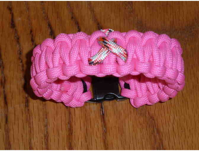 This clever handmade pink bracelet is a series of breast cancer awareness ribbon logos looped together. The braided cable signifies how the lives of the cancer patient, caregiver and healthcare provider are woven together. Very cool, very special. 7.5" in length.