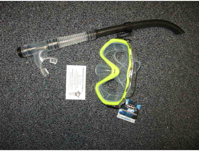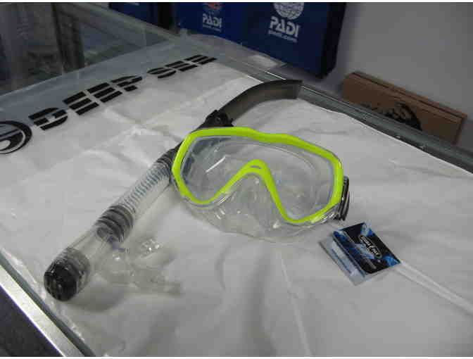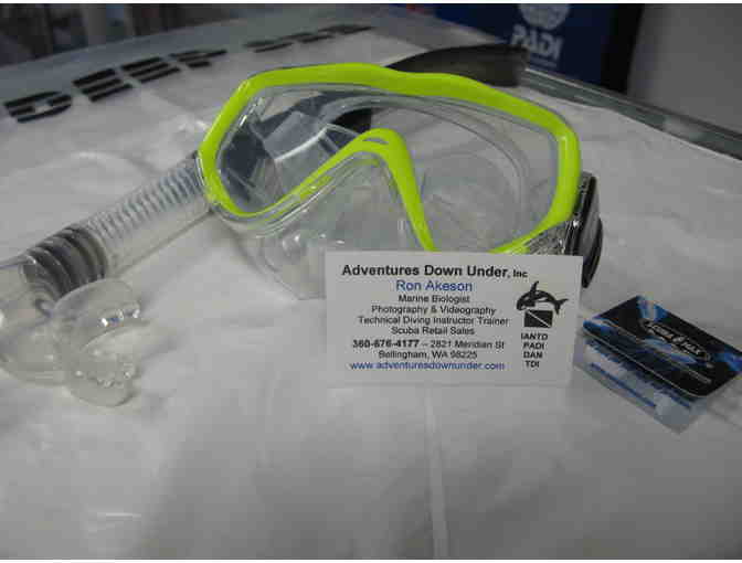 This is a mask made by the company Scuba Max, model Encore and a Dolphin snorkel made by the company Deep See. This set is designed for an adult face but smaller masks are available. They can be used for scuba diving or snorkeling and are lightweight for packing. Shipping the items from Adventures Down Under in Bellingham, WA will be around $12 in the US or they can be picked up at the store!