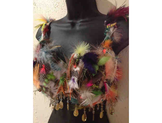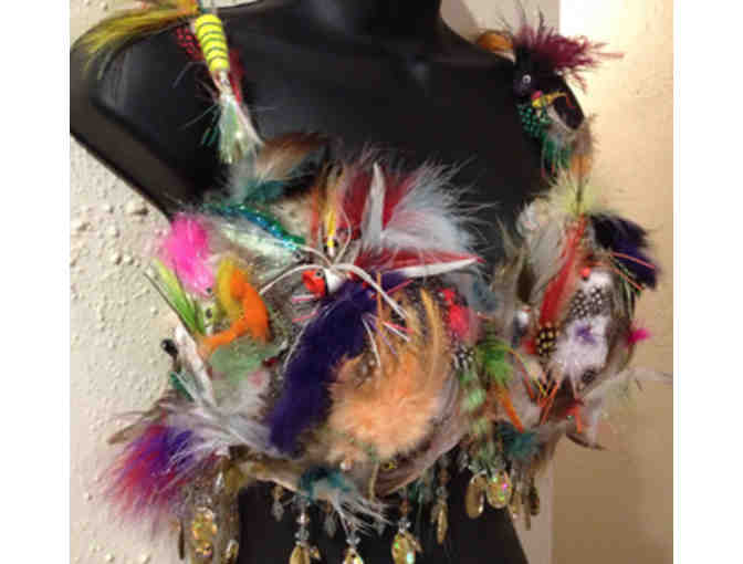 The bra is beautiful and covered in every type of fly imaginable. The bottom is lined with beads and fishing lures.
