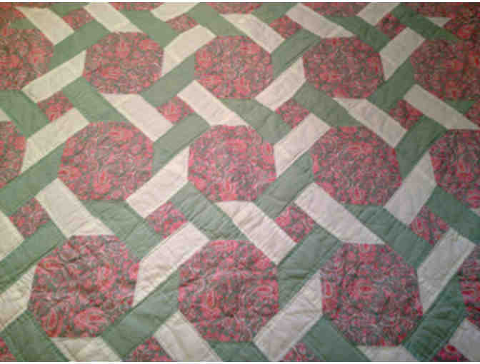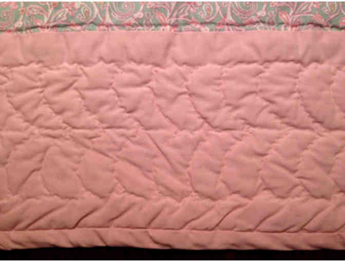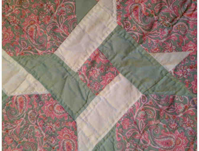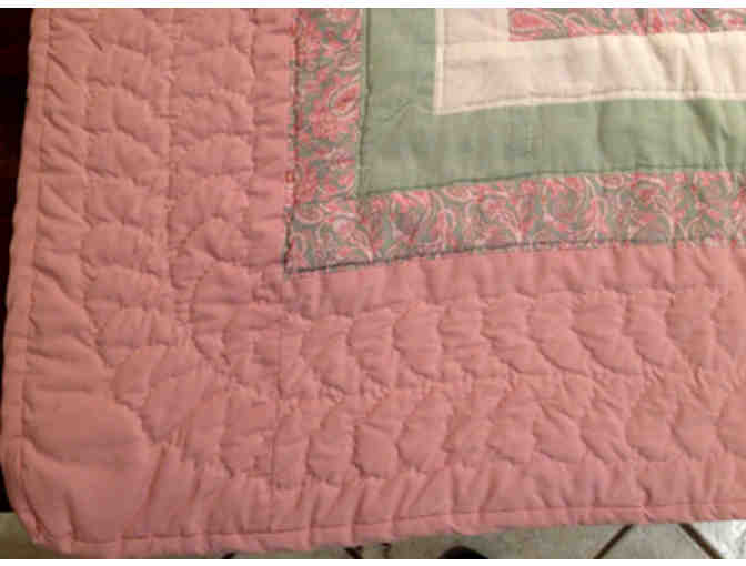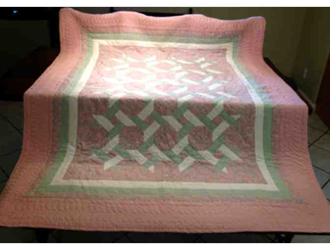 This beautiful and large (61x78) quilt was hand-made, start to finish, by a CFR-Arizona supporter. The quilt incorporates subtle pink and green fabrics and a unique combination of snowball blocks and alternating twist blocks turned on their points. Reverse is solid pink. All quilting is hand-done.