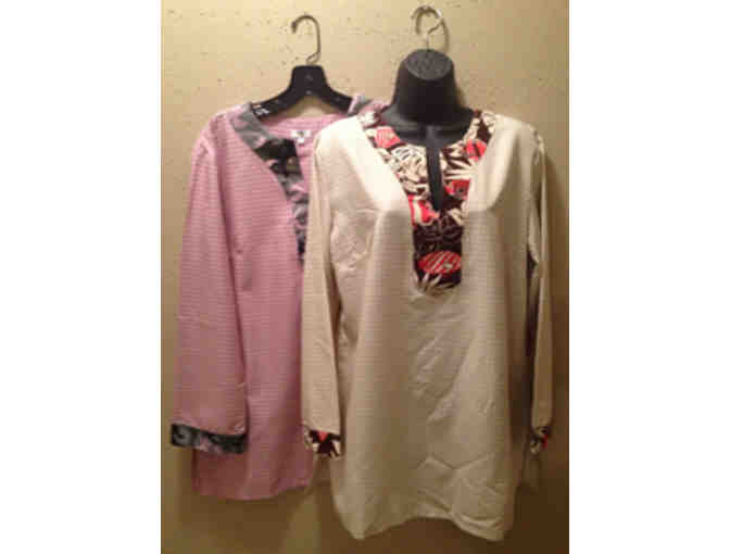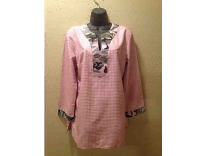 Two (2) women’s tunics, made with 65% Coolmax and 35% Polyester. This set of tunics comes in pink check/camo and tan check/red fish. The shirts have side vents and run true to size.