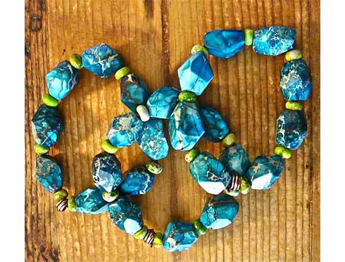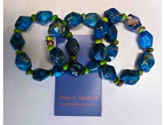 A trio of matching dyed agate bracelets handcrafted by Williamstown, Massachusetts, resident and artist Mary Natalizia. Each bracelet has a copper accent and is strung on heavy-duty elastic. Wear all three or give one to a friend! The amazing colors will add a creative pop to any wardrobe. Fits up to a 7.5" wrist.