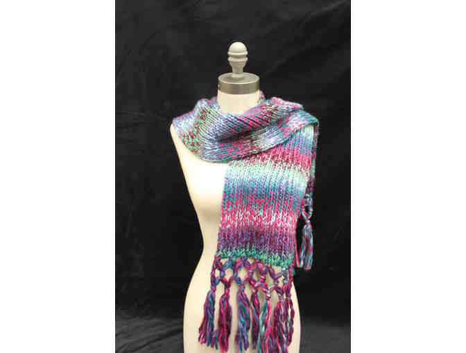 100% cashmere, extra thick knit, long scarf with fringe, in soft blues and greens.