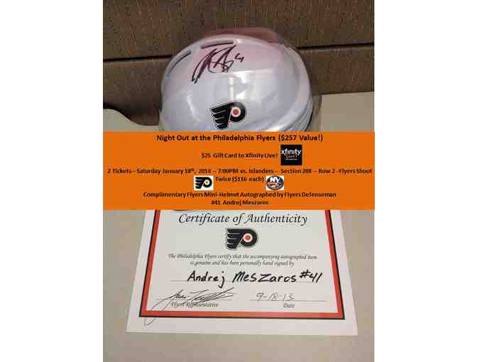 *One Philadelphia Flyers Mini-Helmet signed by defenseman Andrej Meszaros (Certificate of Authenticity included). Some of Meszaros' accomplishments include a spot on the 2006 NHL All-Rookie team, an appearance in the 2007 NHL YoungStars Game, and the 2011 Barry Ashbee Trophy, awarded to the best defenseman on the team.