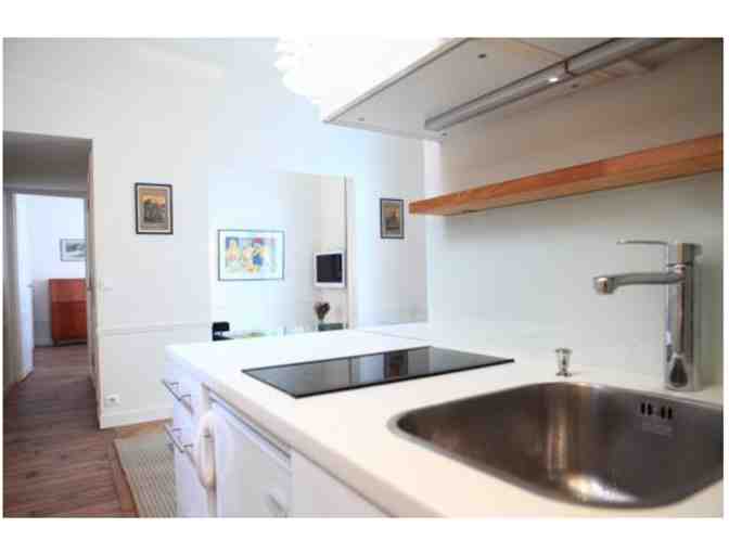 This apartment has a large bedroom with a king size bed, and a fully equipped kitchen, with dishwasher and clothes washer/dryer. There is a "double sejour" (double living space) for the dining room and living room. The living room has a lofted full/double size bed and sliding doors to provide privacy for children or a second couple if necessary (those willing to climb the "ship's ladder" to get up there). The apartment is located on the tage noble (noble floor) of this Napoleon III era building giving it high ceilings, and overlooks the quiet cobble stoned courtyard with original restored horse stables and converted barn, evoking the tranquility and horse-drawn feel of pre-industrial Paris.