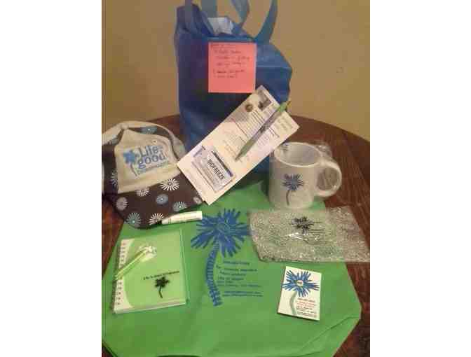 Certificate for one Complimenatry exam and adjustment with Dr. Amanda Smicklas at Life is Good Chiropractic plus gift bag including cap, pen, mug, shopping tote, biofreeze sample, lip balm, note book, hot & cold therapy pack.
